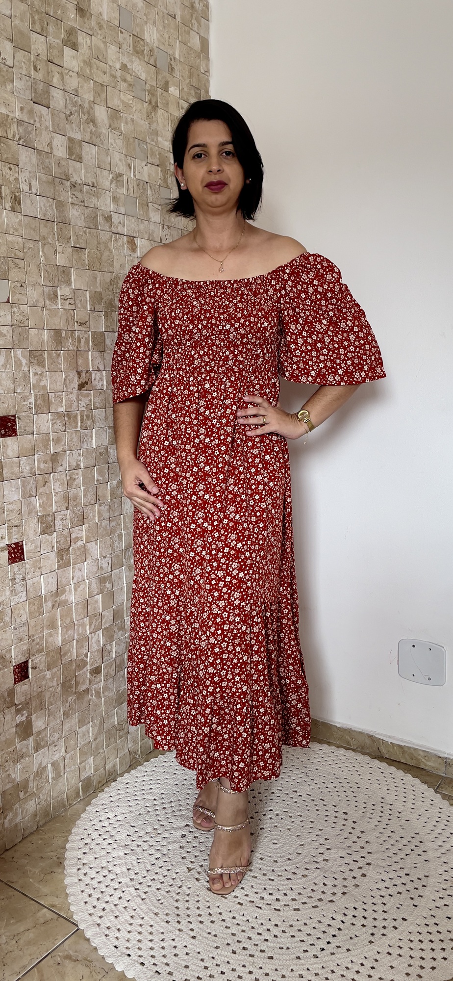 O vestido midi é a definição de leveza com personalidade. Com estampa floral sobre o fundo terracota, ele traz uma estética romântica com toque boho sofisticado. O decote ombro a ombro valoriza o colo de forma delicada, enquanto a modelagem fluida e o comprimento midi alongam a silhueta e garantem conforto em cada movimento.
